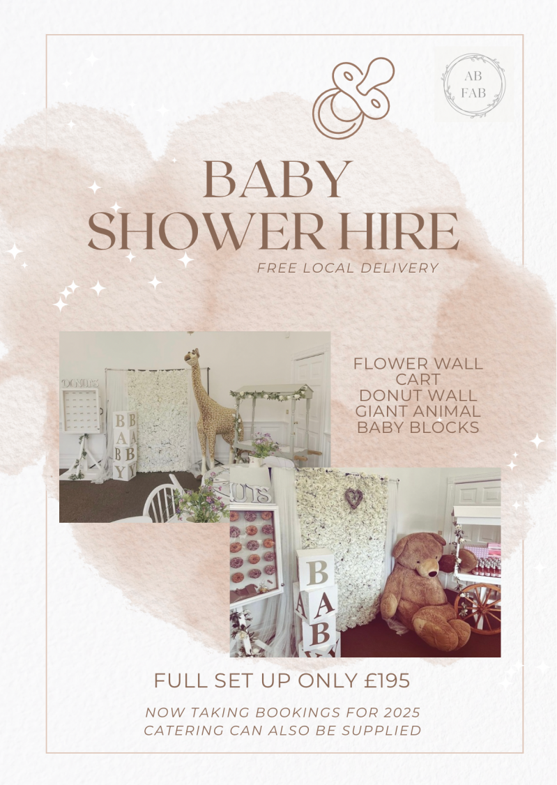 | Full Baby Shower set up ~ flower wall , blocks , cart , donut wall , giant animal | £195 (save £50!) |